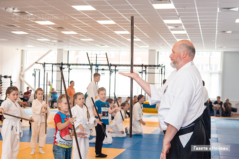 В игровой форме он познакомил младшую группу с основами стиля, историей и философией айкидо, а после провел мастер-класс по обращению с тренировочным оружием.