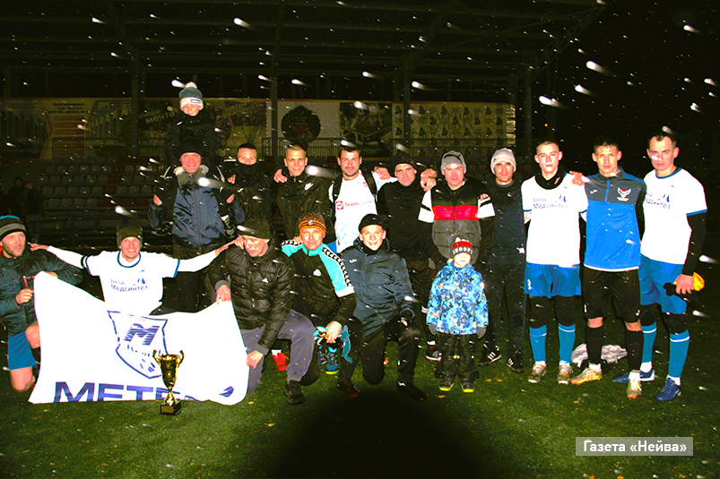 И вот наконец прошел финальный матч кубка города на большом поле, в котором встретились «Метеор-Медсинтез» и «Калифорния». К сожалению, намеченная на воскресенье, 15 октября, игра была почему-то перенесена на 12 октября на 20.00. Что практически лишало любителей футбола посетить матч из-за столь позднего начала. Мало того, из-за слабого освещения невозможно было сделать и качественное фото победителей. Вдобавок в конце игры поднялся ураган. Ветер со снегом даже порвал сетку ограждения футбольного поля.