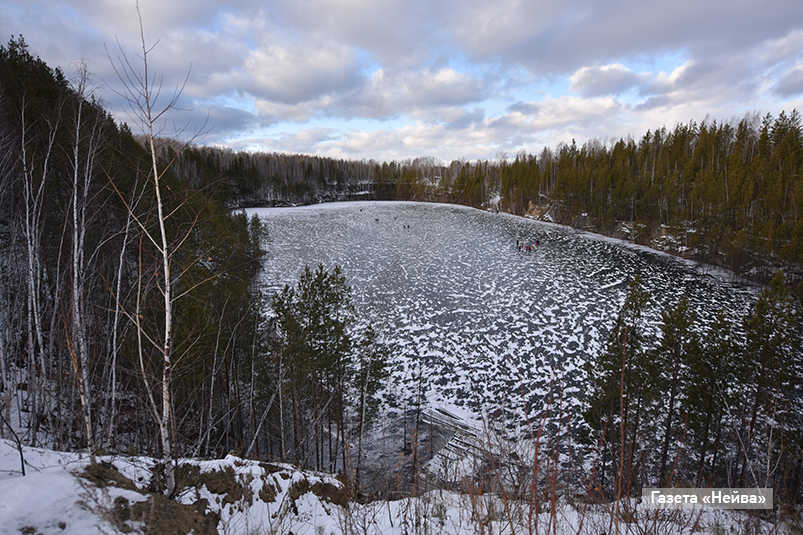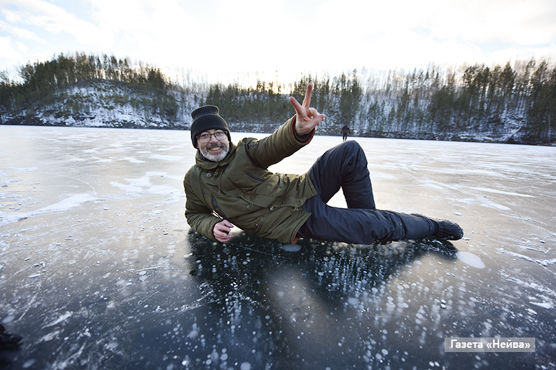 Вот и в этот раз 90% людей, которых мы встретили на карьере, были на коньках. А некоторые целенаправленно и сосредоточенно занимались заготовкой контента для соцсетей. Оно и понятно: под ногами — прозрачный и ровный лёд с застывшими пузырьками воздуха (словно на Байкале). Вокруг — уходящие в высоту уступы, поросшие лесом. И простор — протяжённость карьера — 400 метров, ширина — 250. Мы тоже и нафоткались, и навалялись, и побегали по льду.