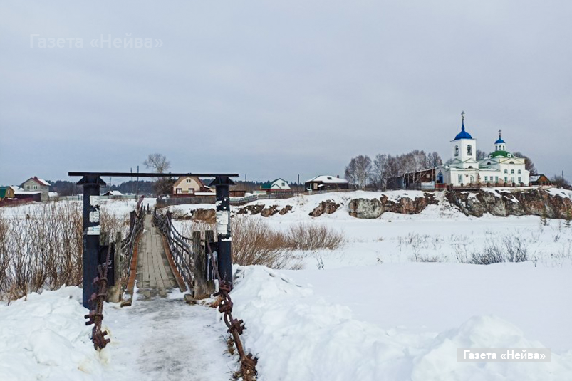 Традиционное начало прогулки — навесной пешеходный деревянный мост, ведущий к храму Георгия Победоносца и, можно сказать, к другой части Слободы. Мост довольно старый и шаткий, но прочный. Он был построен в 1961 году.