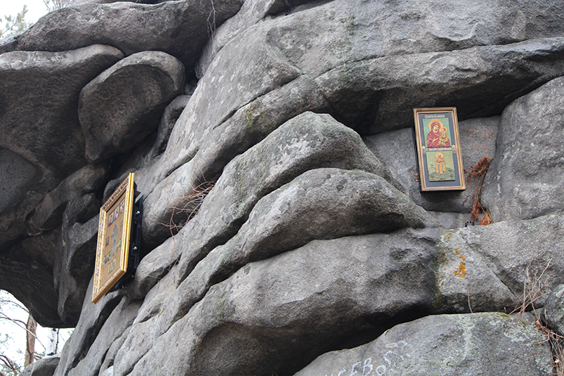 Икон на Острове много. Сейчас не помню, видели ли мы иконы во время первого посещения, но позднее они уже были там. Природа распорядилась так, что под скалой на вершине, с южной ее стороны, имеется неглубокий грот, куда верующие, посетители этих мест, устанавливают иконки. Грот защищен от дождя и ветра, и поэтому иконкам в нем комфортно.